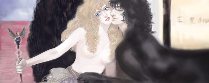 象徴派に憧れていたころは、まさに鬱絶頂でした。「愛撫」を見てガーンときた時、17歳だったので、クノップフ先生のおすましなエロチシズムに興味を持ちました。パロディで久しぶりにこの絵と向き合った時、正直驚きました。クノップフ先生、こんなにブルーでエロかったかなぁと? もちろん今もエロチシズムと思索的な作風には興味があって、こんな風に描きたいと思うところはあるのですが、自分の心根が明るくなったので、以前と印象が変わったのです。
