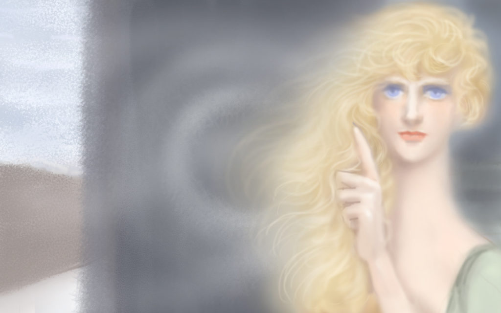 クノップフ先生の絵は、扉の向こうにさざ波が迫って、女性の後ろにエーテルの輪が浮かんでいて、引きこむように異界の風が吹いているのと、扉の向こうの海風が共振しています。当時、エーテルの輪を画面に描きこむのは、斬新な手法だったのでしょうね。