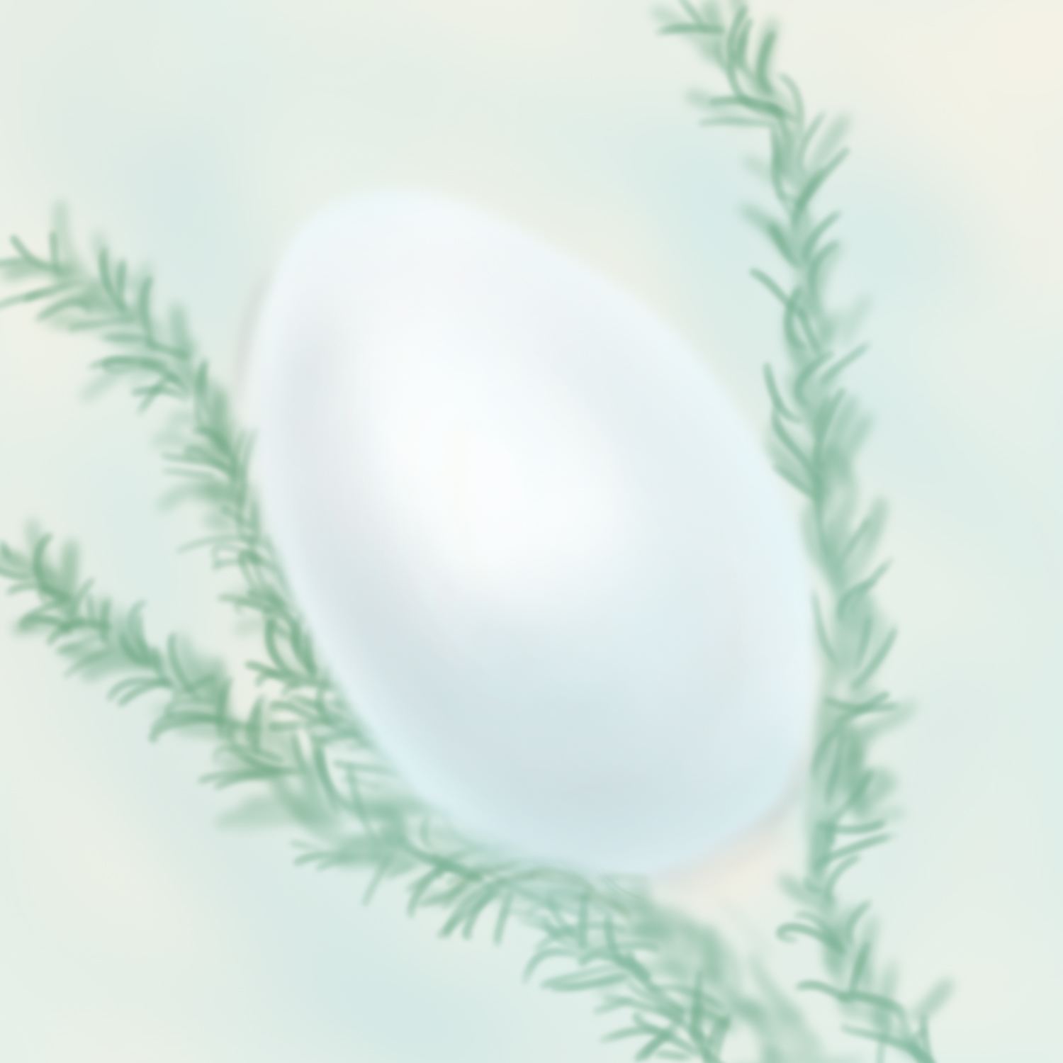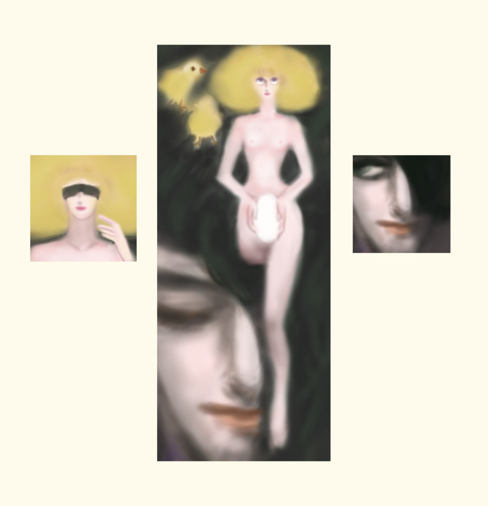 女性がたまごを持っているのは、エロティシズムへの言及もさることながら、生まれ変わりのイメージもあります。というのは当時、鬱から立ち直ったばかりで、とてもビジュアルな夢を毎日、見ていました。仙骨調整のS先生にも言われて、夢日記をつけるようになっていました。そんな中、水草に抱かれて眠っている大きな卵の夢を見ました。とても美しかったので、夢のたまごを想い浮かべると、癒されました。印象が強すぎて、すぐには絵に描けませんでしたが、いつかこの美しい夢を、描こうと思いました。以後、随所にたまごのイメージが現れるようになったのです。
