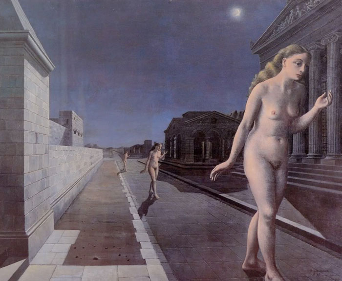 月に照らされた古代ローマのパルテノン。不安げに大きな目をした女性が立っている。無人の大通りにいるのは、このヌードの女性だけ。画面の奥に向かってこの女性が3人、同じポーズで立っている。絵のタイトルは「こだま」・・・まさに、繰り返しの反響を視覚化しているポール・デルヴォーの世界。繰り返しって神秘的だったんですね。