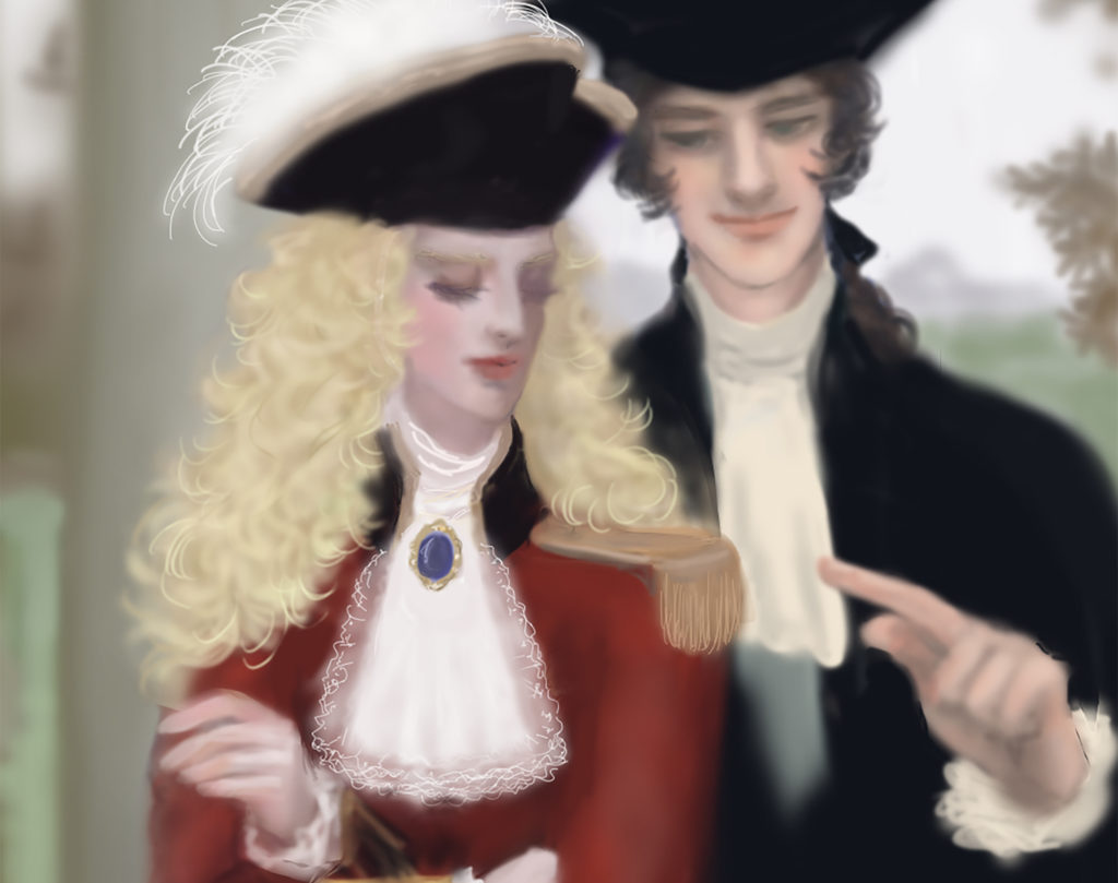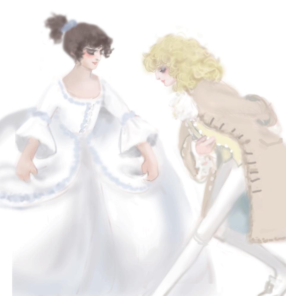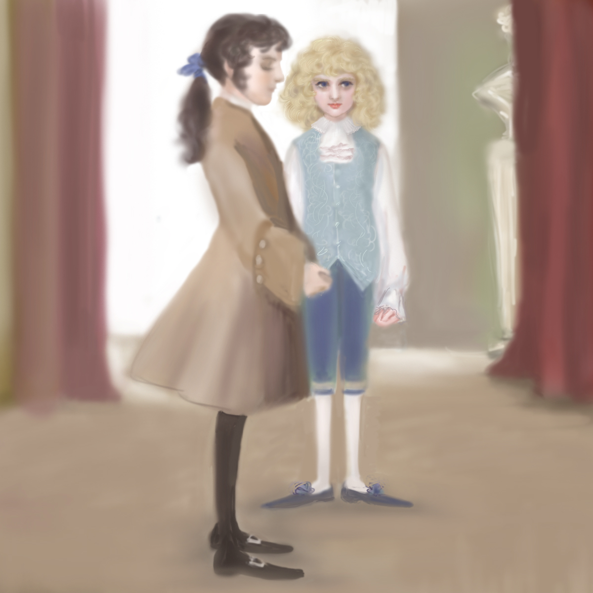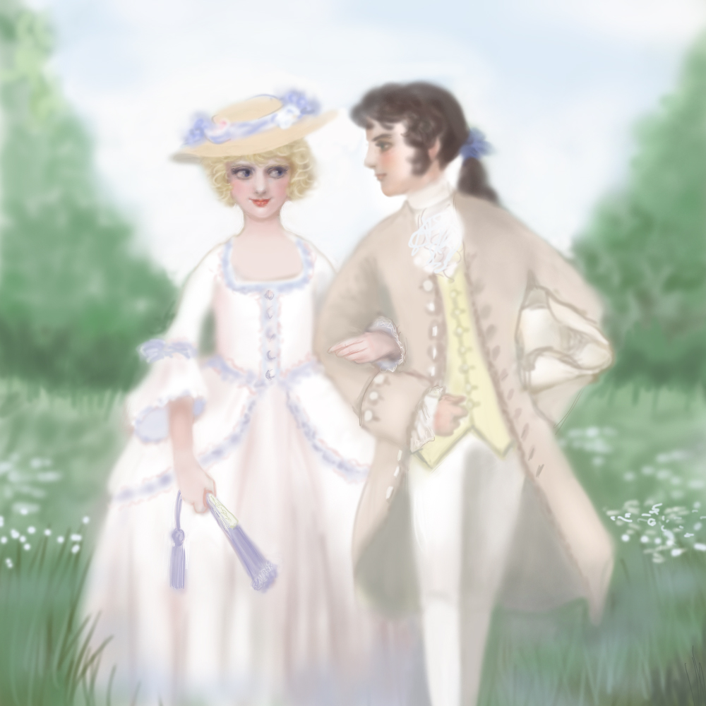 飾りのついた麦の帽子、夏のドレスなら簡単に着られるから、ちょっと庭を散策。白い小花の匂いが鼻をくすぐる。小さな紳士淑女も花のよう。