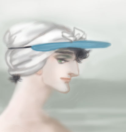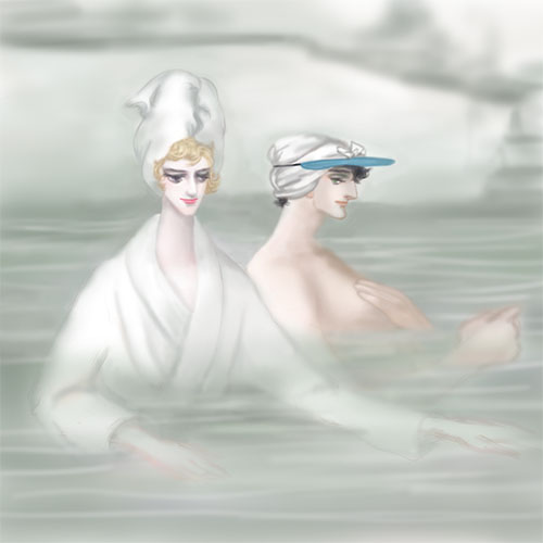 GIF画像の説明:映画の温泉シーンでは、女性は頭にタオルをまいて、バスローブを着て、ほかにつれの男性が3人いて、一緒に温泉につかっているのですが、ひとり中折れ帽をかぶった人がいて、温泉に帽子かぶって入るのかと、面白かったのでアレンジして描きました。青いサンバイザーはシメオン・シャルダン(18世の風俗画家)の自画像から拝借。シャルダン先生、髪を布巾みたいな布でくるんで、眼鏡をかけて、青い日よけを着けているのでした。日よけの素材は何なのか、絵を見ても判然としませんが(革?フェルト?)この時代に、もうサンバイザーの発想があったんだと、帽子大好きの私は喜んでしまいました。