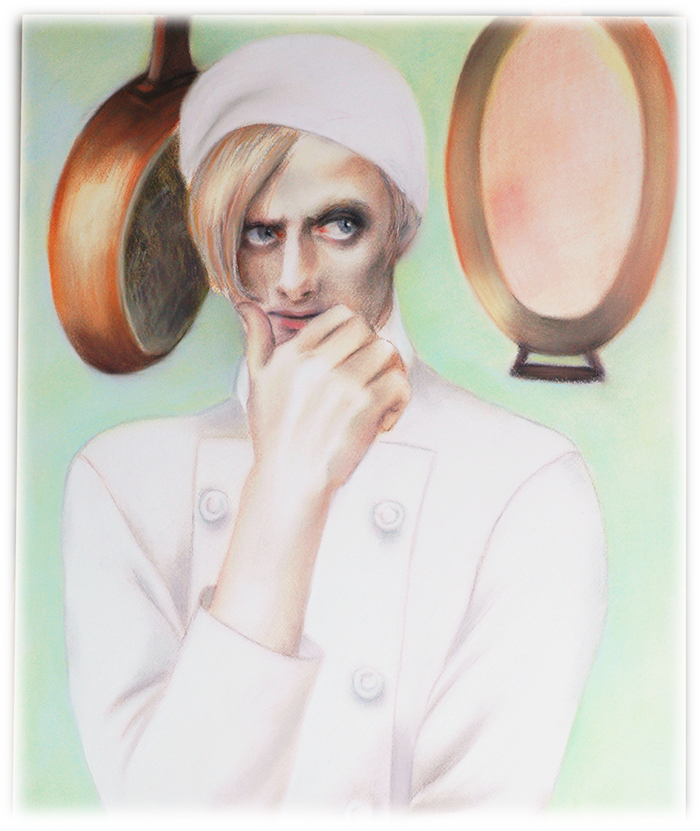 彼は卵の料理人「卵の料理人」という絵があって、彼の傍らには大きな卵をもっている女性がいて(彼女はひよこの化身。どうしてひよこなのかは、いずれまた・・・)それで二人のストーリーを描こうとしていました。当時の記憶を辿ると、恋物語というよりは、キッチンの魔性を描こうとしていたように思えます。何で台所に魔性なのって、思われるかも知れませんが、最近見つけた本のタイトルに「キッチンの悪魔」と言うのがあって、ああ、やっぱりと思いました。本の内容は、イギリス人シェフがフランスで三ツ星を維持する奮闘記ですが、家族ではない大勢の人のために料理をする大きな台所には、たしかに魔性があると、私は経験から知っていました。というのは、寮母をしていた祖母の働くキッチンで、私は多くの時間を過ごし、私自身、5歳になる前から台所に立っていたからです。強制ではなく、何でもやってみたい子供の好奇心からでした。