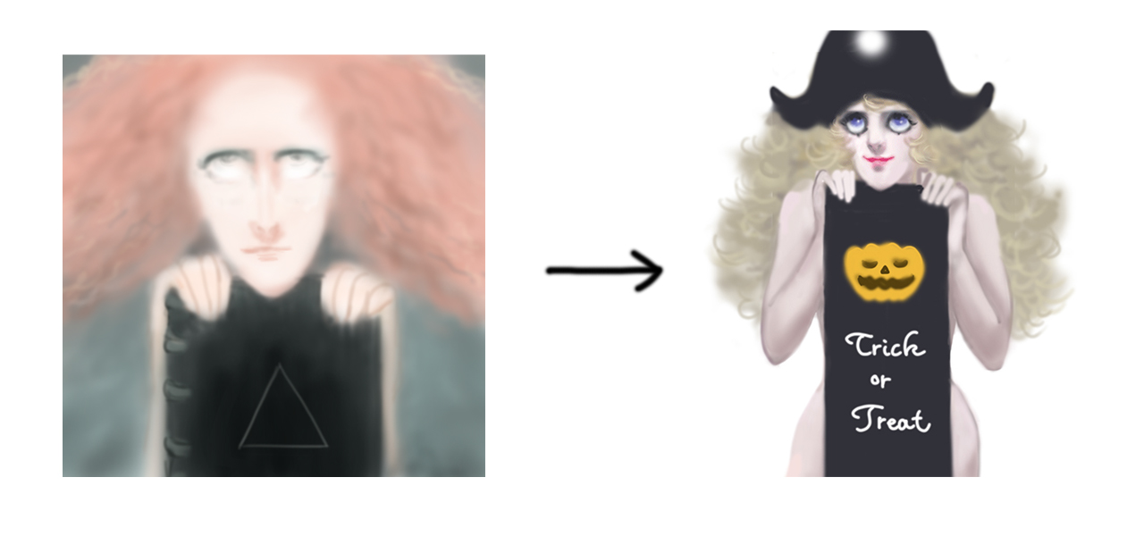 一昨日アップしたハロウィンな女性像、デルヴィル先生の「Mysteriousa」のパロディだと書き添えるのを忘れていましたので、本日はパロディの雑談と、させて頂きます。