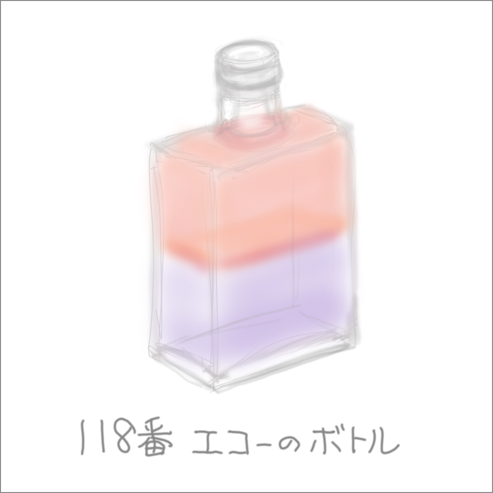 先週、帰宅途中に見たコーラルピンクとモーブに染まった空を見て、この二色使い、きっとオーラソーマのボトルの色だろうと調べてみたら、118番のエコーだったのです。
