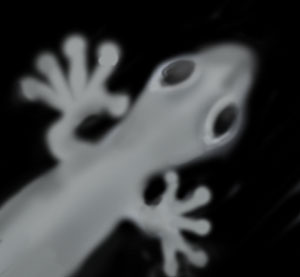 一晩寝たらヤモリのことなんか忘れていた。それでいつも通り、起き抜けに手洗いのドアを開けたら、あっ睨んでいる!黒々と目をむいてこちらを! ヤモリの目ってこんなに大きかったっけ? ポチっと小さな目のハズが爛々とこちらに迫ってくる。まだいたんだねぇ、窓のところに・・・どぎまぎしながらドアを閉める。あの黒目玉!残像を振り払う。