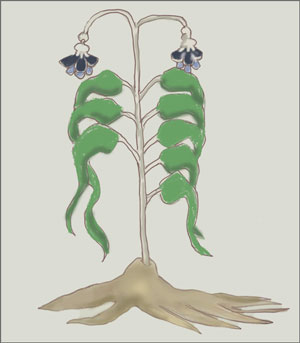 仙骨についても書いてあって、背骨の中を流れるシステムラインが作られている(P.32)とある。背骨のエネルギーラインを作る植物は、仙骨部分にあたる根っこで歩き回っているという。根っこが仙骨、脊椎、肋骨(葉っぱの並び方が、何となく肋骨チック)それから首、そして花の部分が脳へつながる仕組み。