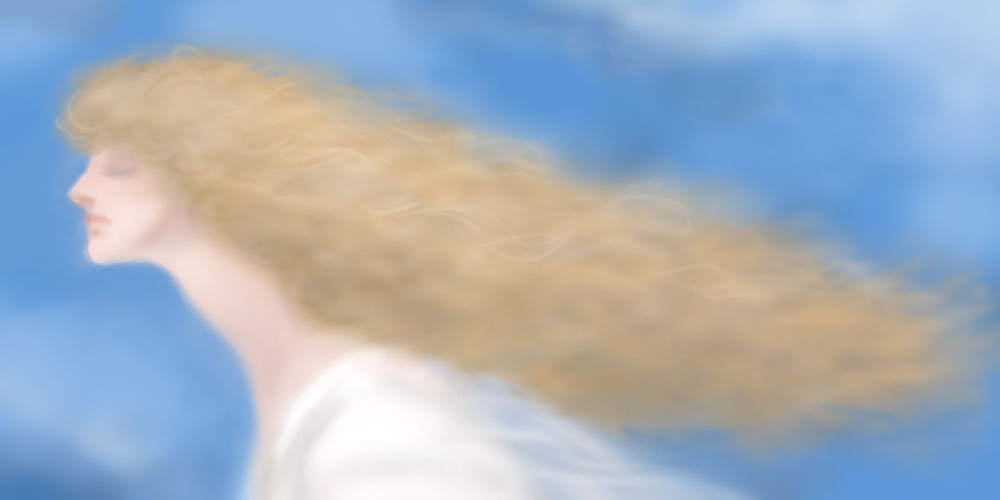 この青空になびく亜麻色の髪のイメージを、フォトショで描いたらすぐ描けて、パステルで描いたらまだ仕上がらなくて・・・